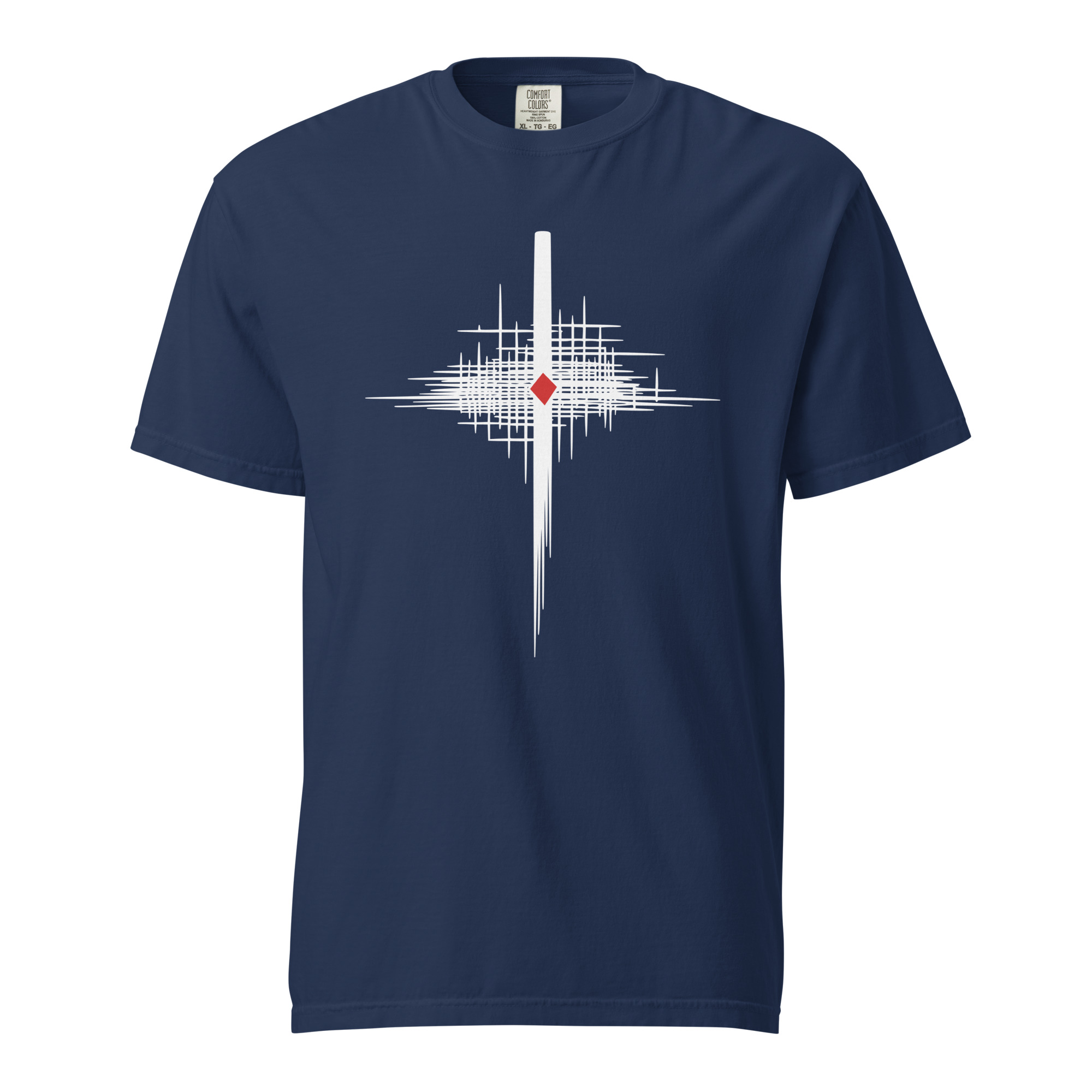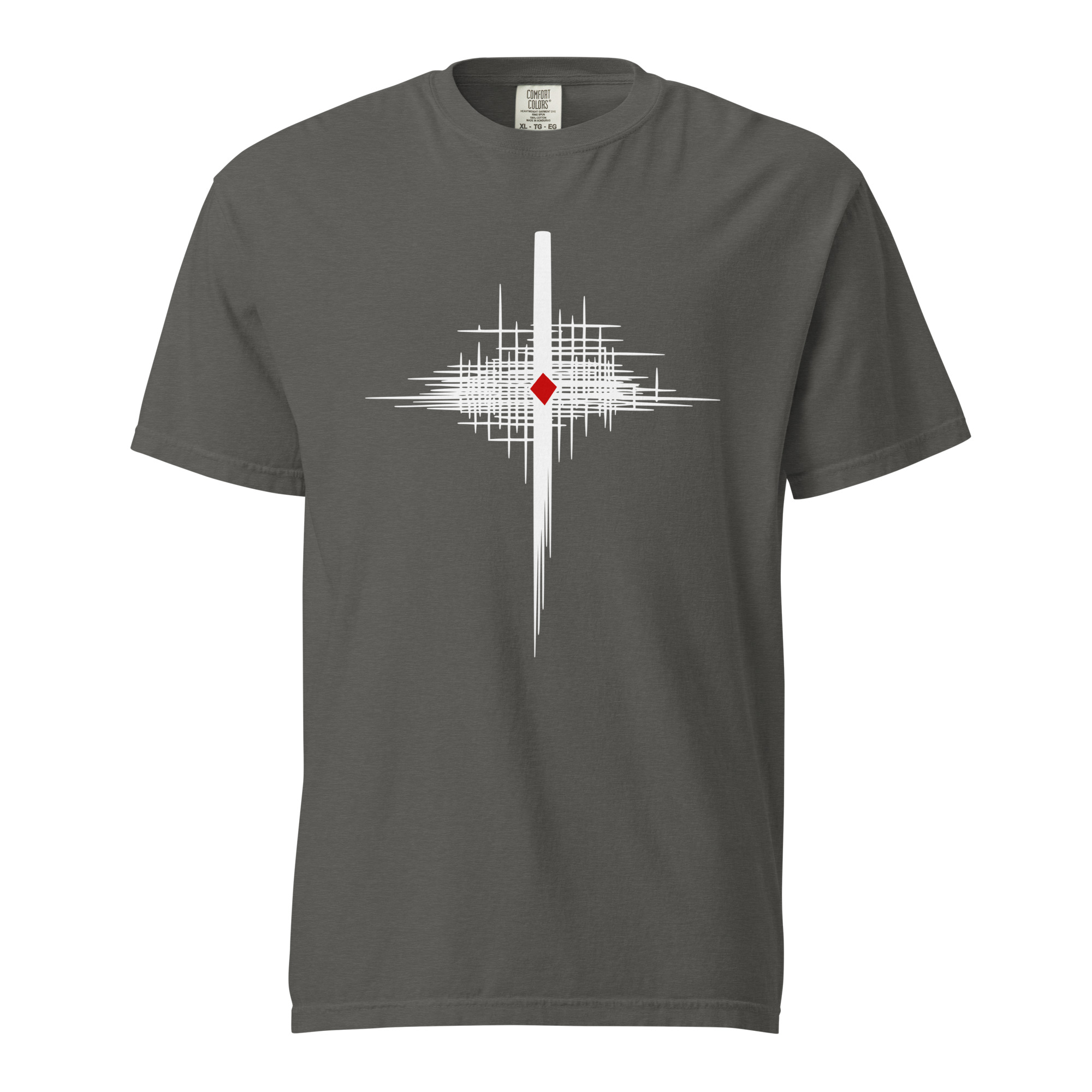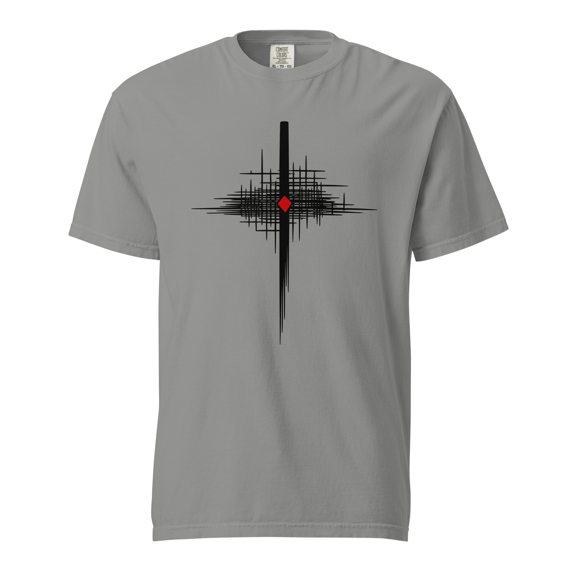 A central vertical bar tapers as it descends, cutting through a wide, jagged arrangement of intersecting black lines. The density is highest at the midpoint. A red diamond is positioned within this central cluster. My attention remains with that red point.