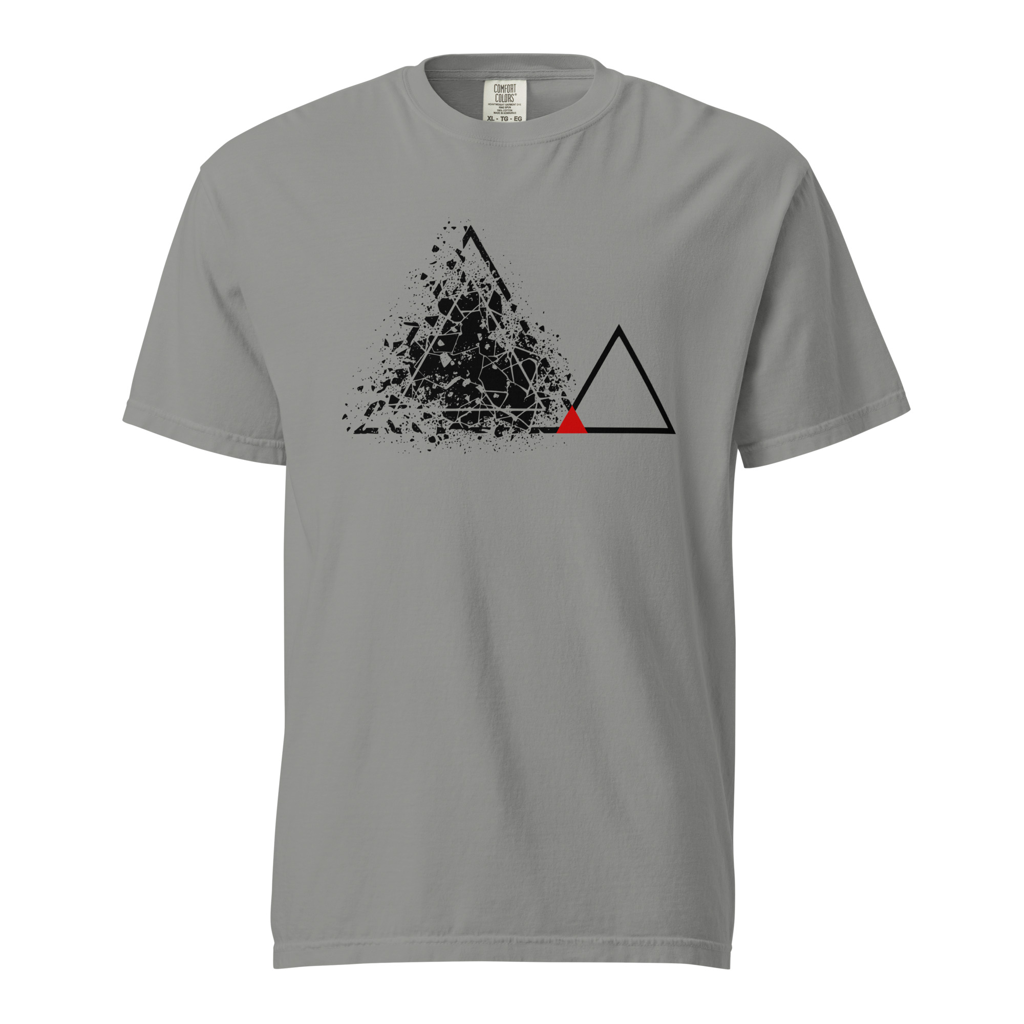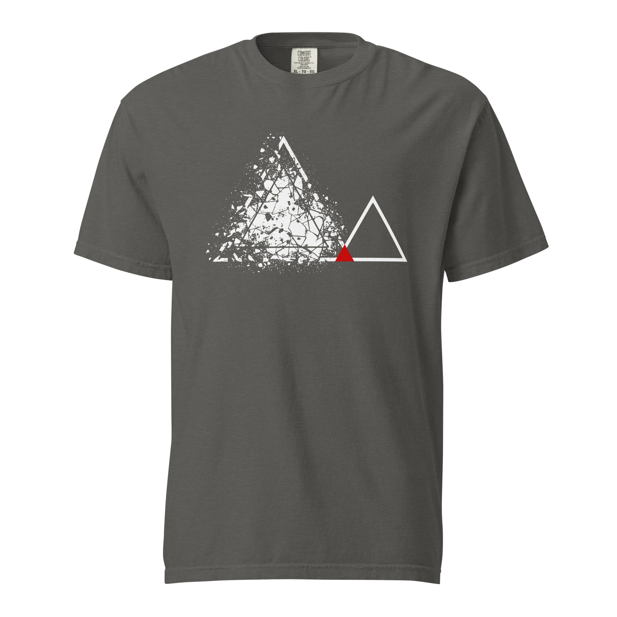 A fragmented triangular mass spreads across the left side of the chest. To the right, a clean triangular outline holds its edge. A red triangle rests at the base where the two forms meet. My eye returns to that sharp point.