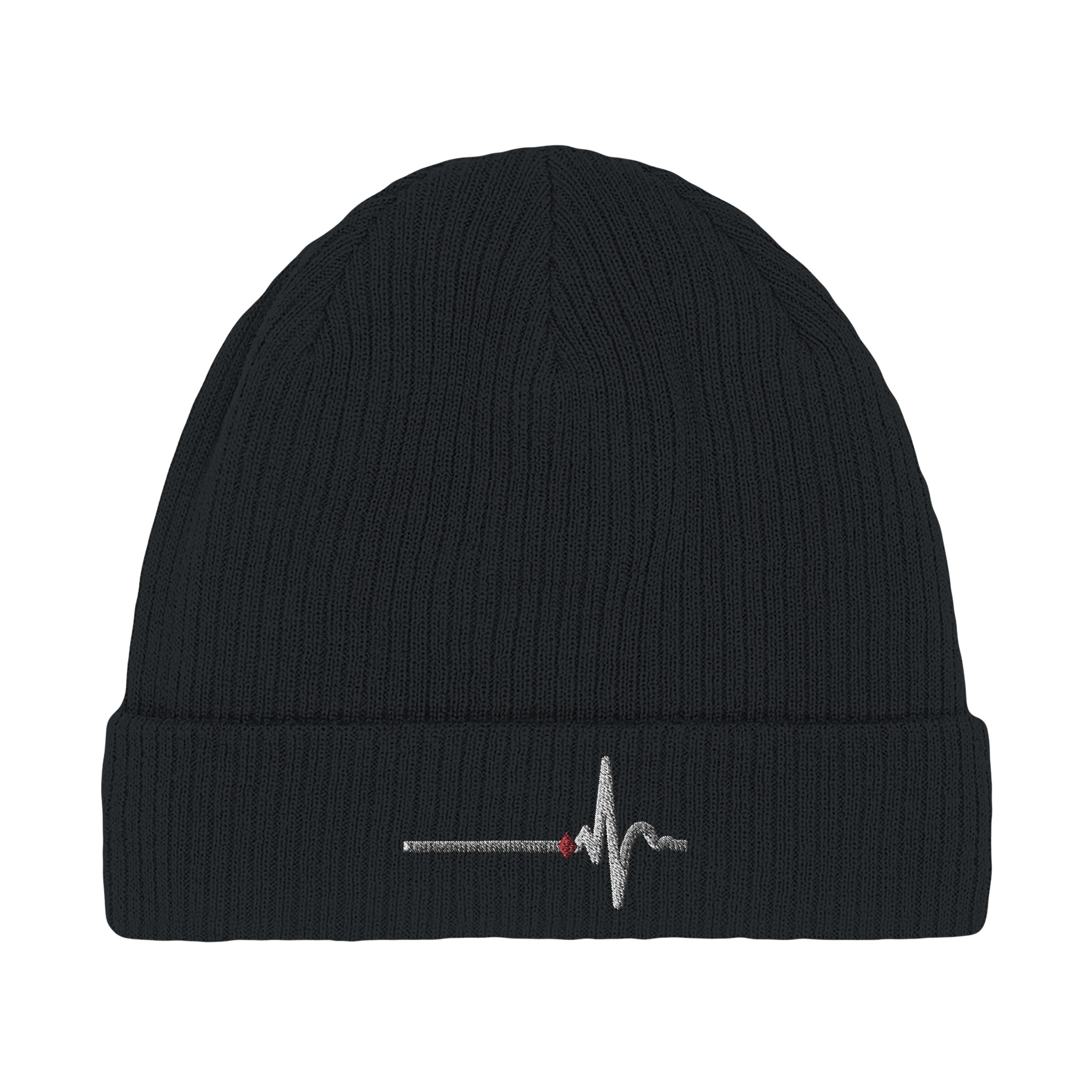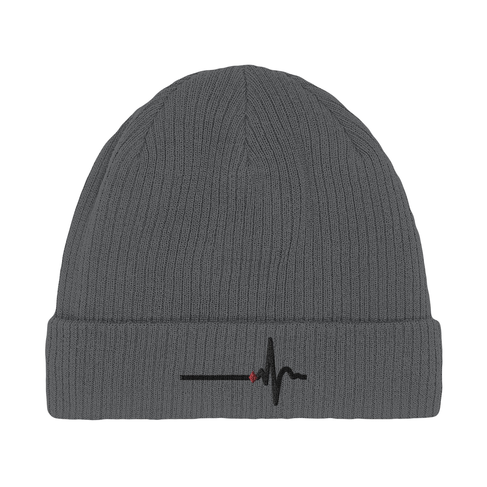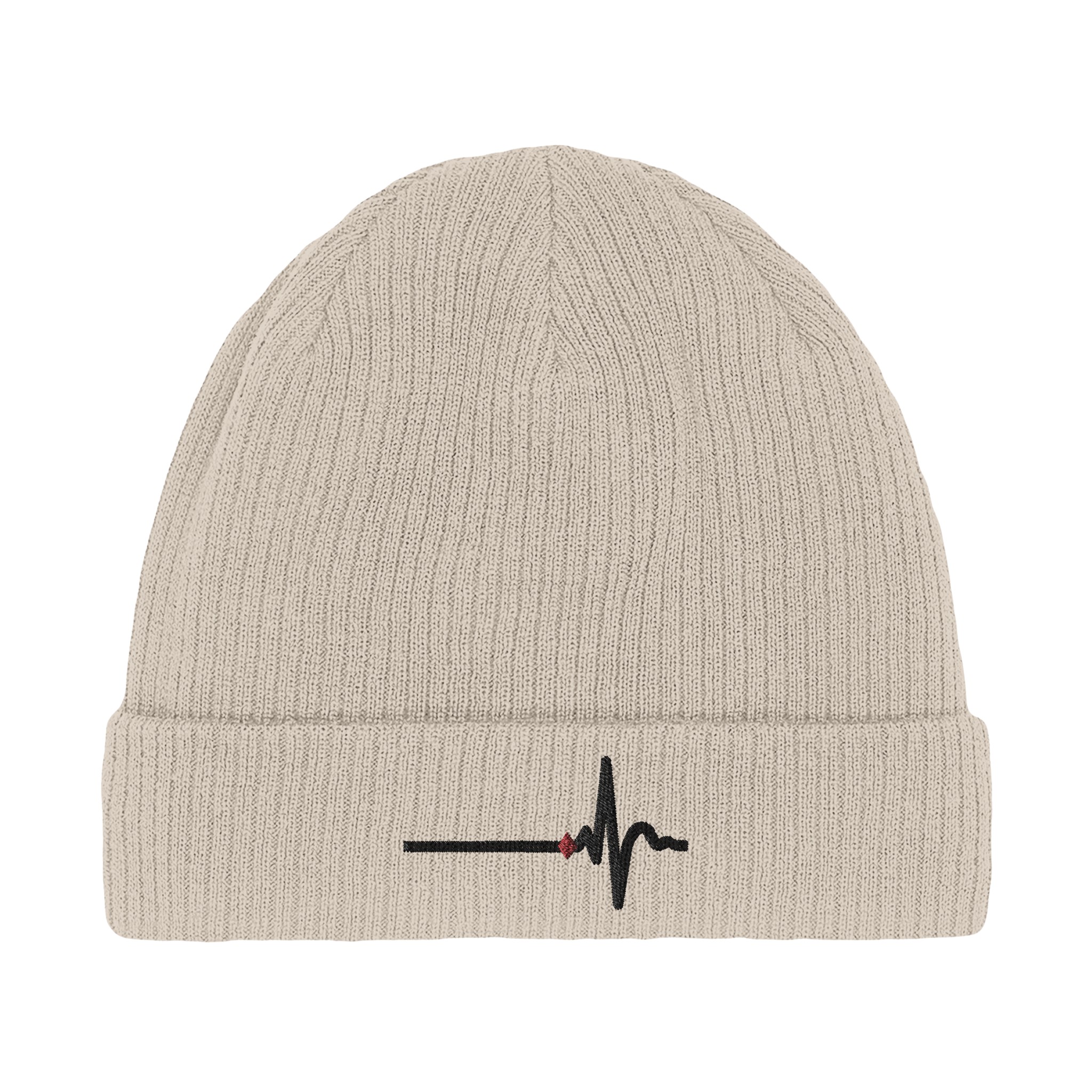 I’ve spent a lot of time moving through the day without really being in it, noticing how easily the hours can flatten into something smooth and unmarked. There’s a quiet exhaustion in that — the slow pull of drifting on autopilot, set against the part of me that still wants to feel something sharp and present. I call this Awake // Asleep, not as a claim, just as a way of naming where staying conscious and slipping back into ease sit beside each other. In this organic beanie, I notice a long, steady line that holds, and one place where it breaks before settling again. Sometimes it feels like smooth ground broken once, then smoothed again. The red diamond is where my attention returns when that shift becomes noticeable — not a fix, just a small, physical point I come back to while both states continue.